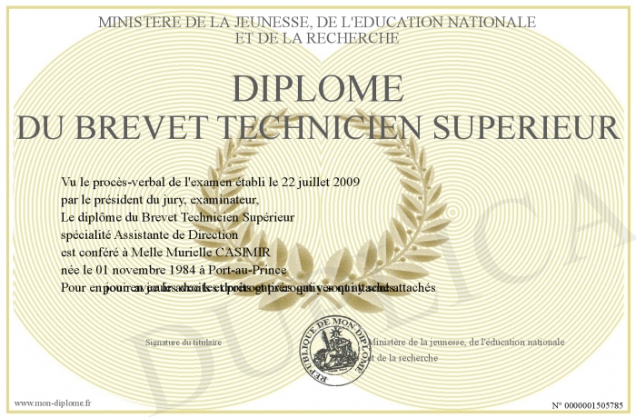 Envoyez par email votre Diplôme du Brevet Technicien Supérieur personalisé