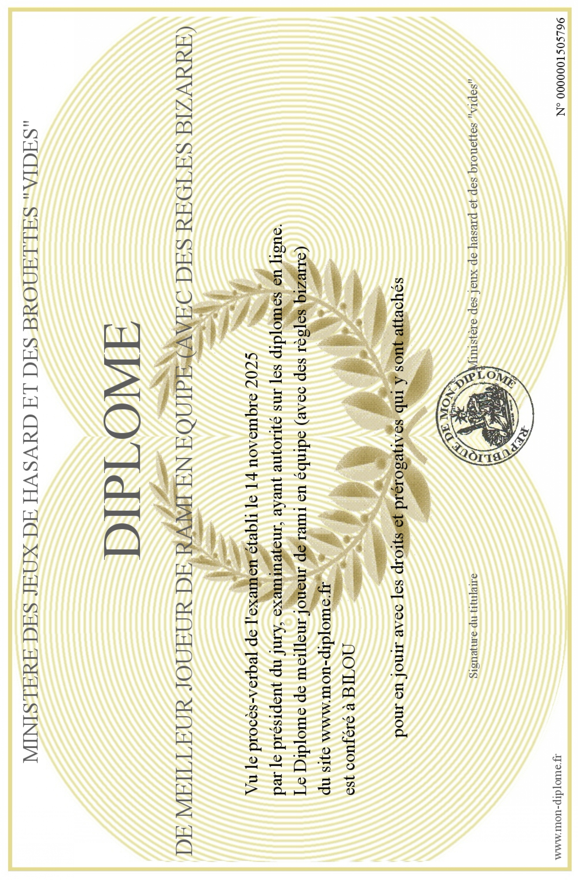 Envoyez par email votre Diplôme de meilleur joueur de rami en équipe (avec des règles bizarre) personalisé