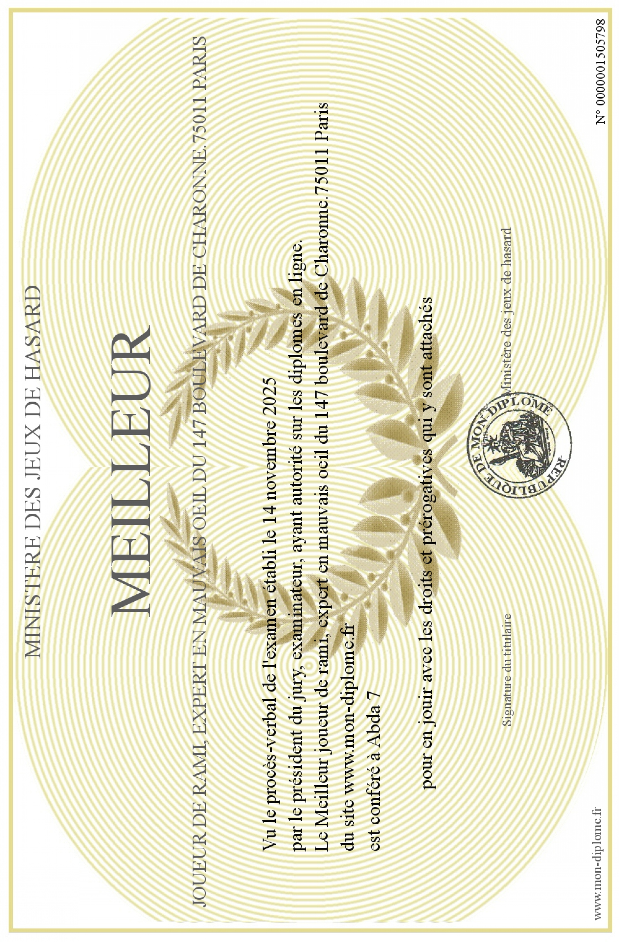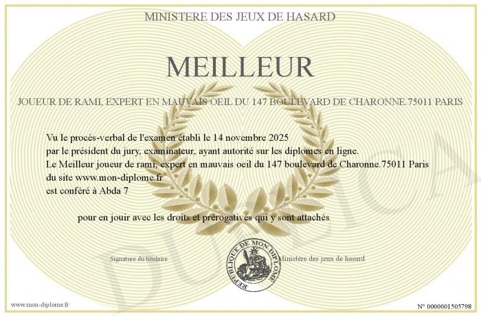 Envoyez par email votre Meilleur joueur de rami, expert en mauvais oeil du 147 boulevard de Charonne.75011 Paris personalisé