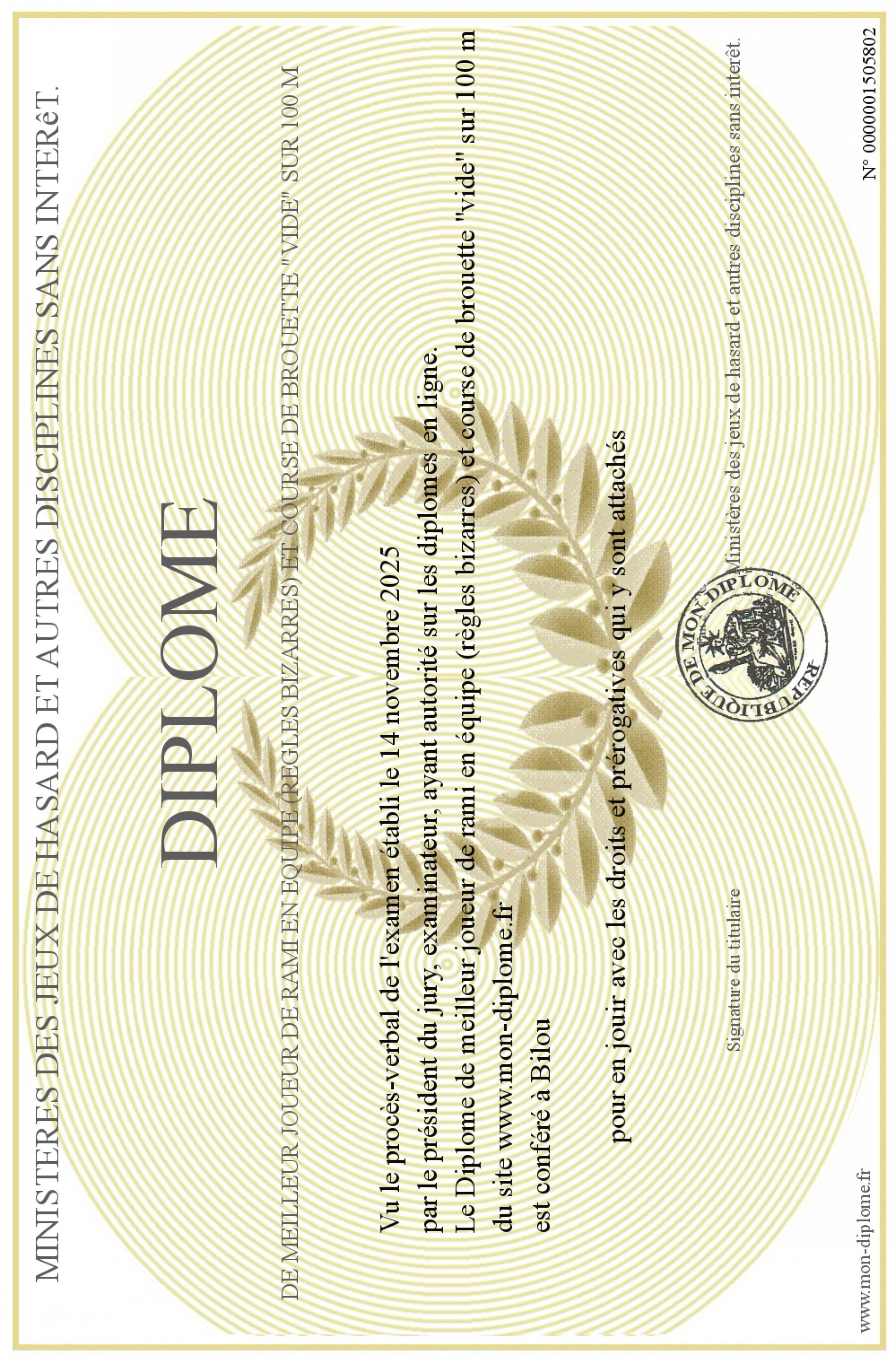 Envoyez par email votre Diplôme de meilleur joueur de rami en équipe (règles bizarres) et course de brouette -vide- sur 100 m personalisé