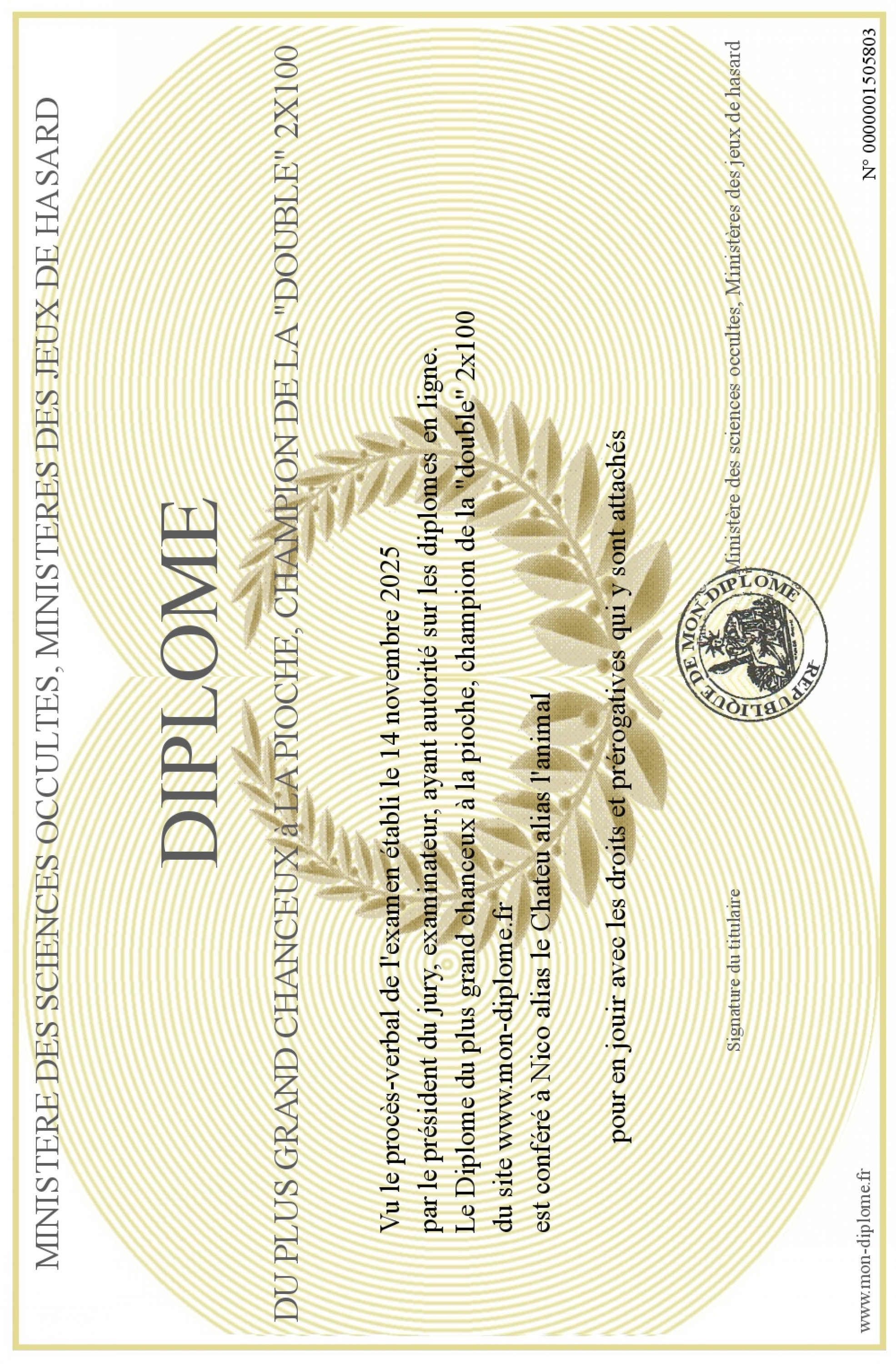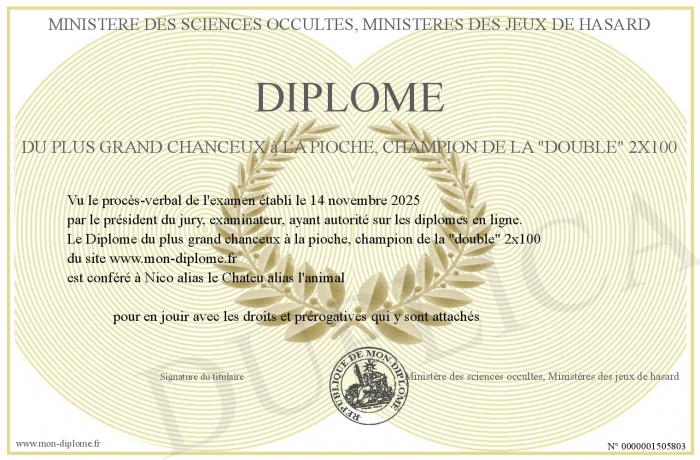 Envoyez par email votre Diplôme du plus grand chanceux à la pioche, champion de la -double- 2x100 personalisé
