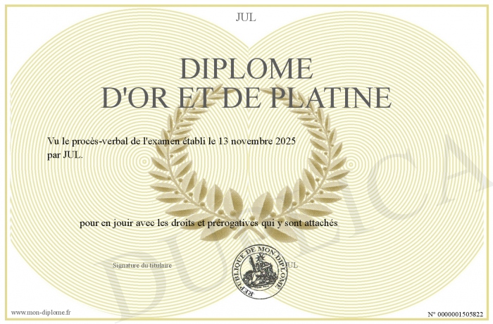 Envoyez par email votre Diplôme d'or et de Platine personalisé