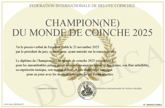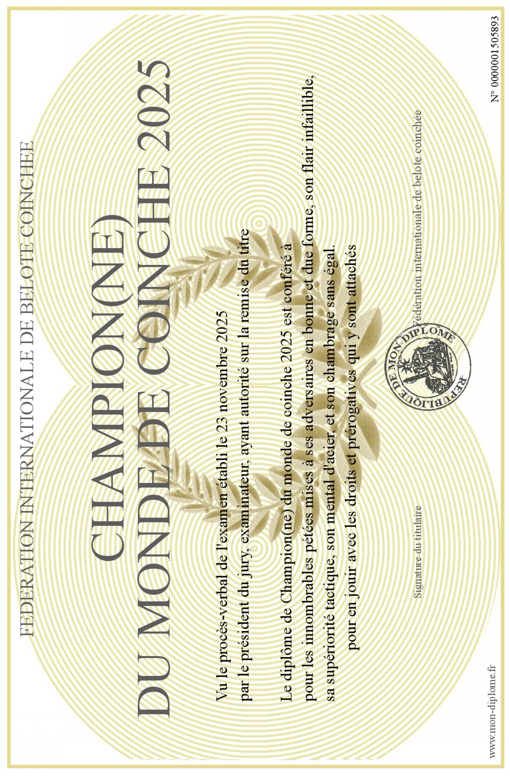 Envoyez par email votre Champion(ne) du monde de coinche 2025 personalisé