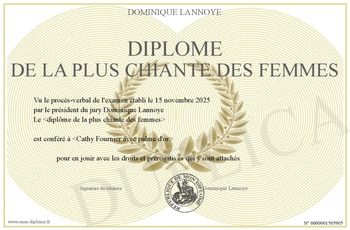 Envoyez par email votre Diplôme de la plus chiante des femmes personalisé