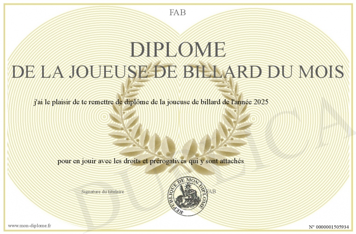 Envoyez par email votre Diplôme de la joueuse de billard du mois personalisé
