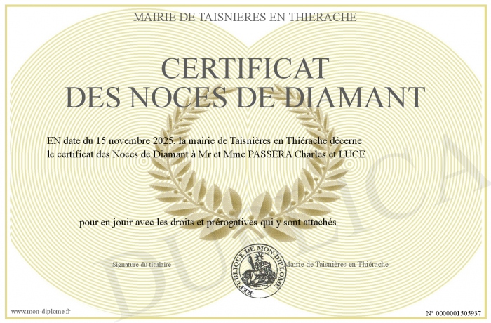Envoyez par email votre CERTIFICAT DES NOCES DE DIAMANT personalisé