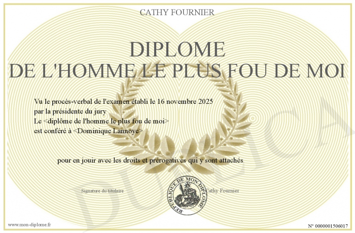 Envoyez par email votre Diplôme de l'homme le plus fou de moi personalisé