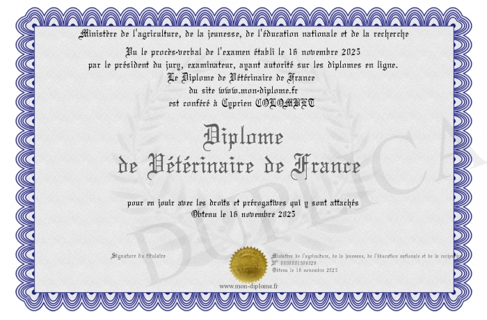 Envoyez par email votre Diplôme de Vétérinaire de France personalisé