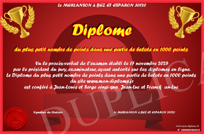 Envoyez par email votre Diplôme du plus petit nombre de points dans une partie de belote en 1000 points personalisé
