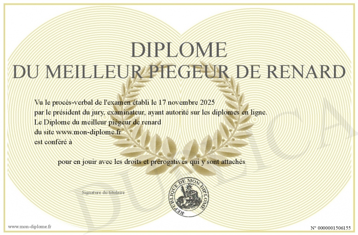 Envoyez par email votre Diplôme du meilleur piégeur de renard personalisé