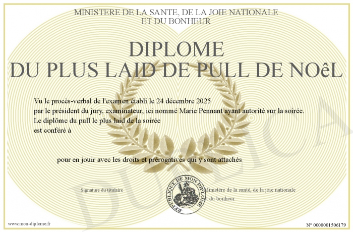 Envoyez par email votre Diplôme du plus laid de pull de Noêl personalisé