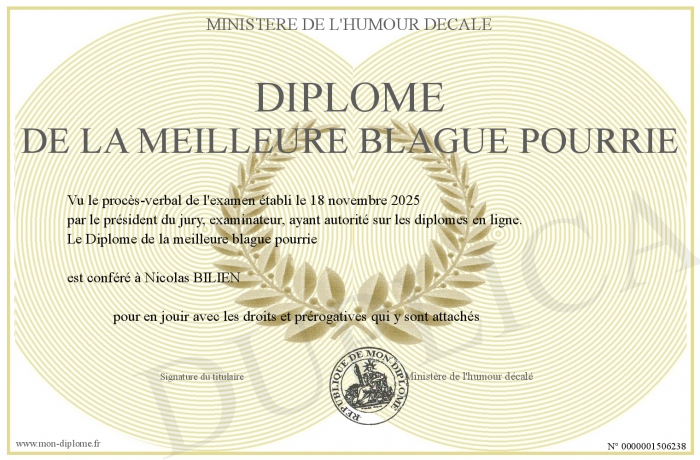 Envoyez par email votre Diplôme de la meilleure blague pourrie personalisé