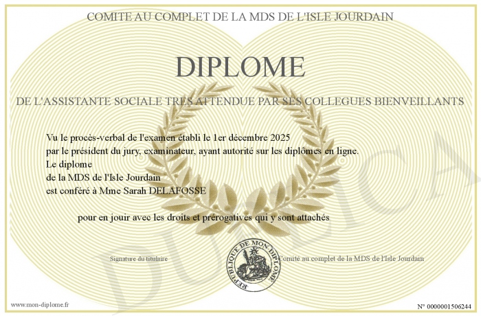 Envoyez par email votre Diplôme de l'Assistante Sociale très attendue par ses collègues bienveillants personalisé