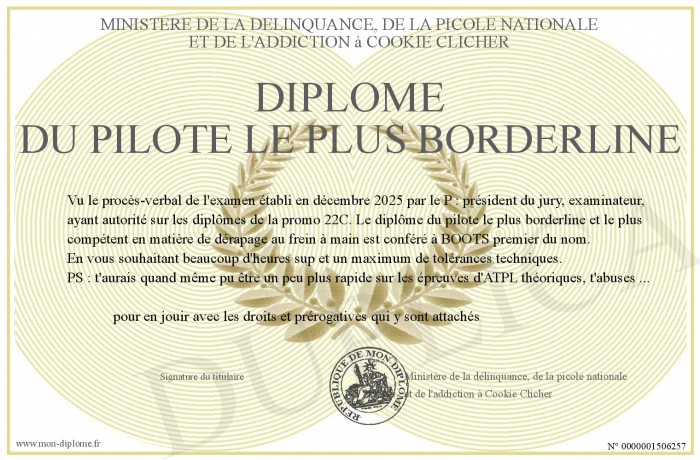 Envoyez par email votre Diplôme du pilote le plus borderline personalisé