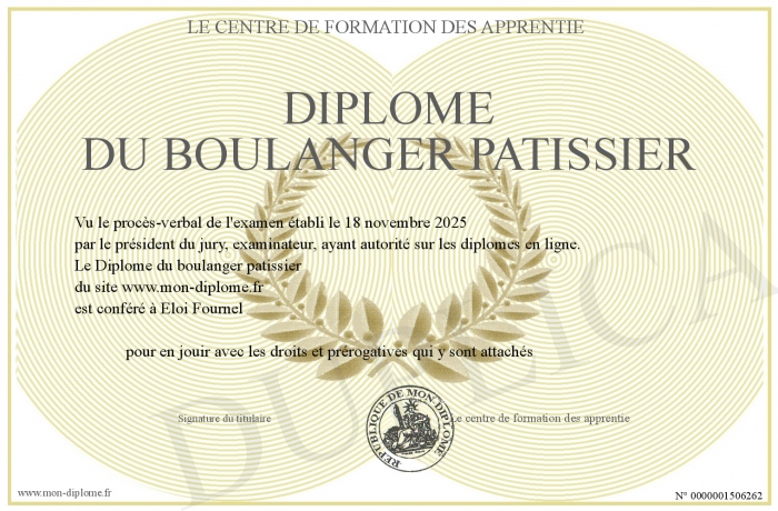Envoyez par email votre Diplôme du boulanger patissier personalisé