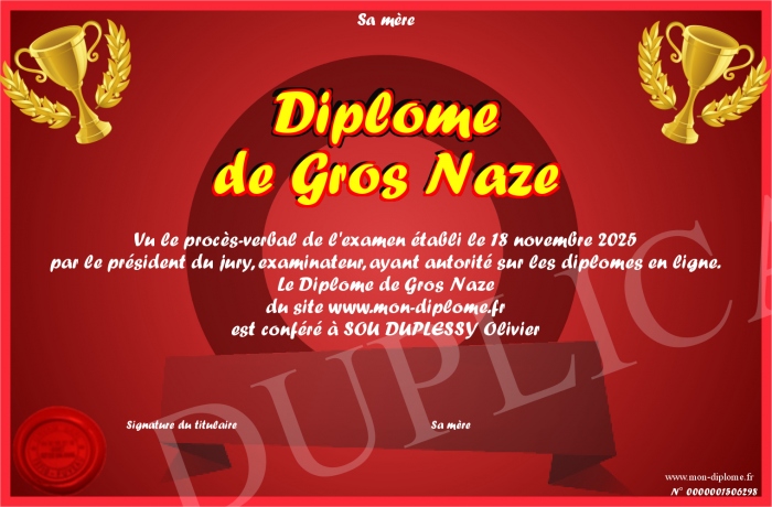 Envoyez par email votre Diplôme de Gros Naze personalisé