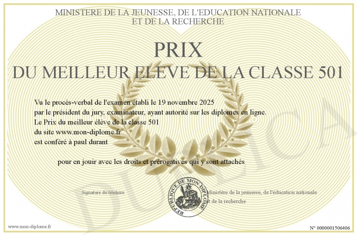 Envoyez par email votre Prix du meilleur élève de la classe 501 personalisé