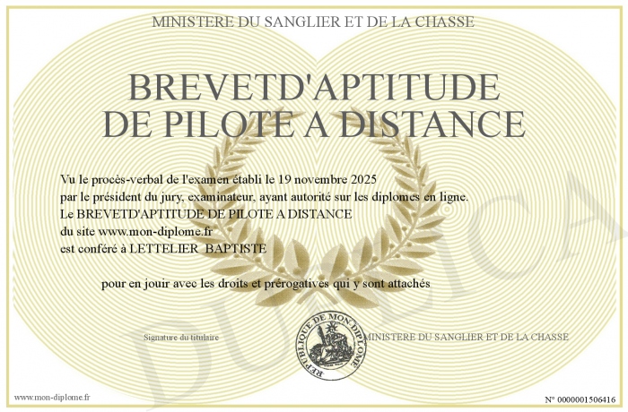 Envoyez par email votre BREVETD'APTITUDE DE PILOTE A DISTANCE personalisé