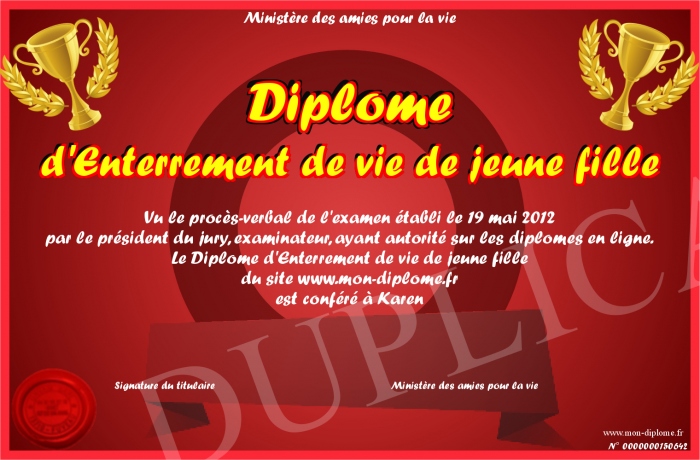Envoyez par email votre Diplome d'Enterrement de vie de jeune fille personalisé