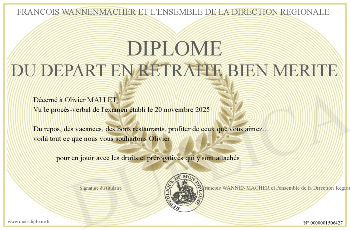 Envoyez par email votre DIPLOME DU DEPART EN RETRAITE BIEN MERITE personalisé