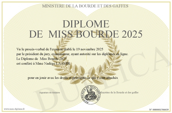 Envoyez par email votre Diplôme de Miss Bourde 2025 personalisé