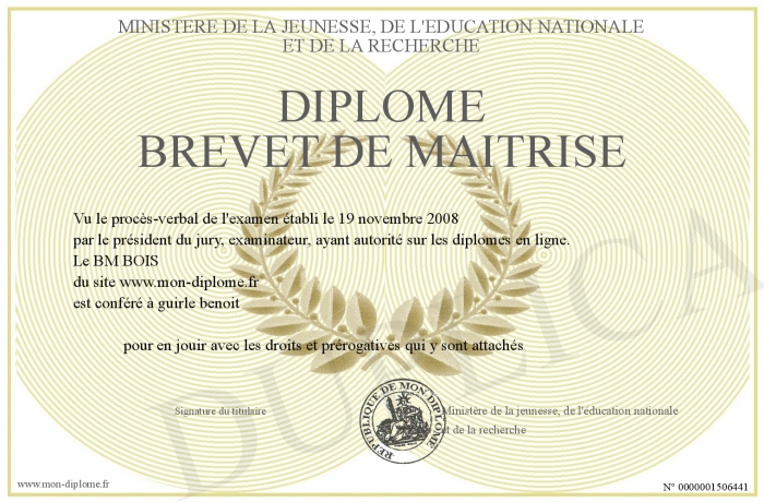 Envoyez par email votre Diplôme BREVET DE MAITRISE personalisé