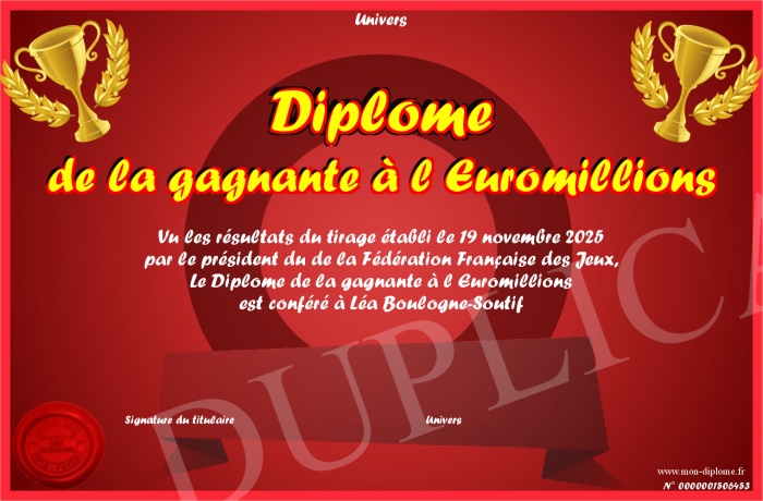 Envoyez par email votre Diplôme de la gagnante à l Euromillions personalisé