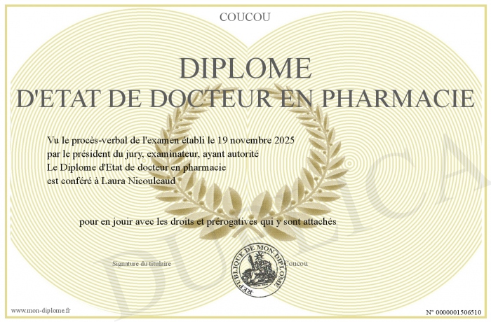 Envoyez par email votre Diplôme d'Etat de docteur en pharmacie personalisé