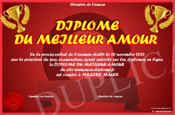 Envoyez par email votre DIPLOME DU MEILLEUR AMOUR personalisé