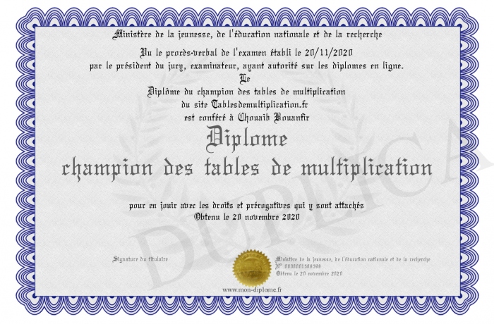 Envoyez par email votre Diplôme champion des tables de multiplication personalisé
