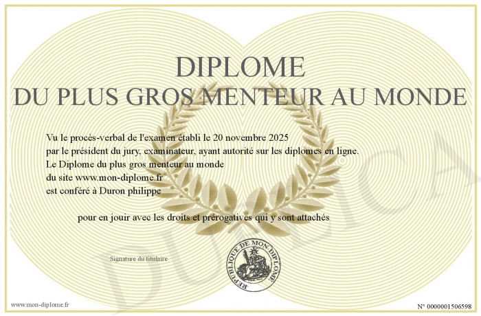 Envoyez par email votre Diplome du plus gros menteur au monde personalisé