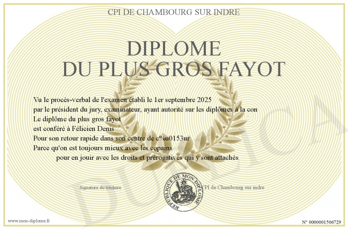 Envoyez par email votre Diplôme du plus gros fayot personalisé