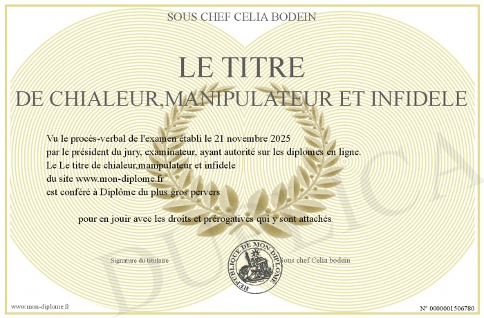 Envoyez par email votre Le titre de chialeur,manipulateur et infidele personalisé