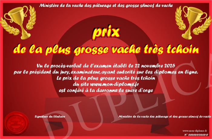 Envoyez par email votre prix de la plus grosse vache très tchoin personalisé
