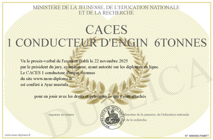 Envoyez par email votre CACES 1 conducteur d'engin 6tonnes personalisé