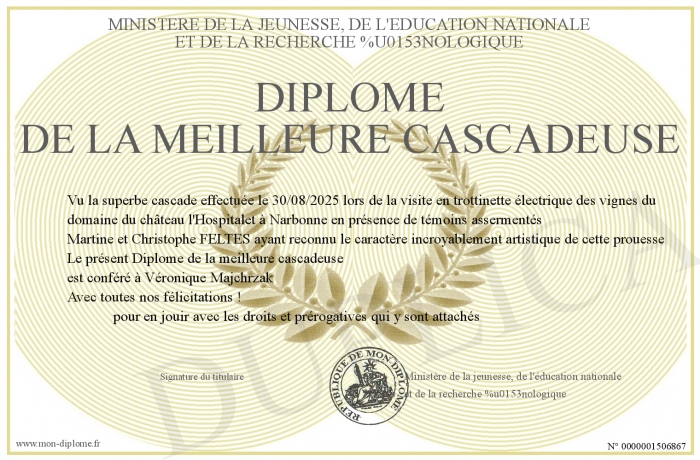 Envoyez par email votre Diplôme de la meilleure cascadeuse personalisé
