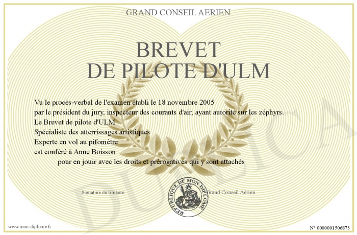 Envoyez par email votre Brevet de pilote d'ULM personalisé