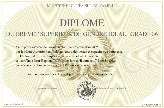 Envoyez par email votre Diplôme du Brevet Supérieur de gendre idéal Grade 36 personalisé