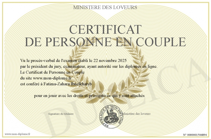 Envoyez par email votre Certificat de Personne en Couple personalisé