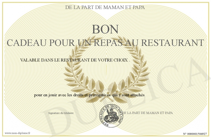 Envoyez par email votre BON CADEAU POUR UN REPAS AU RESTAURANT personalisé