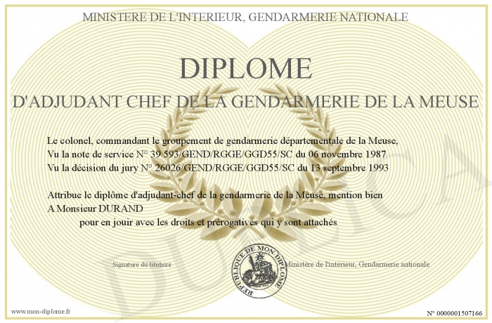 Envoyez par email votre Diplôme d'adjudant chef de la gendarmerie de la meuse personalisé