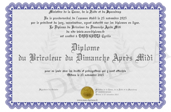 Envoyez par email votre Diplôme du Bricoleur du Dimanche Après Midi personalisé
