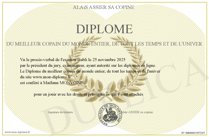 Envoyez par email votre Diplôme du meilleur copain du monde entier, de tout les temps et de l'univer personalisé