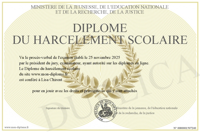 Envoyez par email votre Diplôme du harcèlement scolaire personalisé