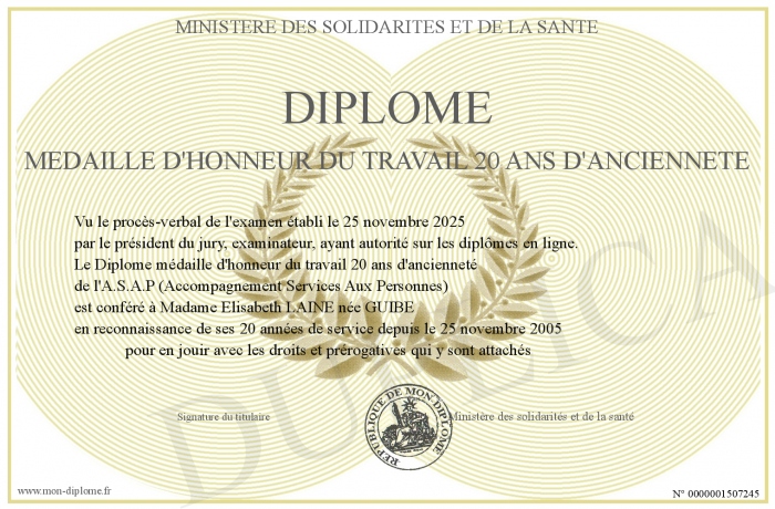 Envoyez par email votre Diplôme médaille d'honneur du travail 20 ans d'ancienneté personalisé