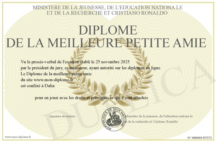 Envoyez par email votre Diplôme de la meilleure petite amie personalisé
