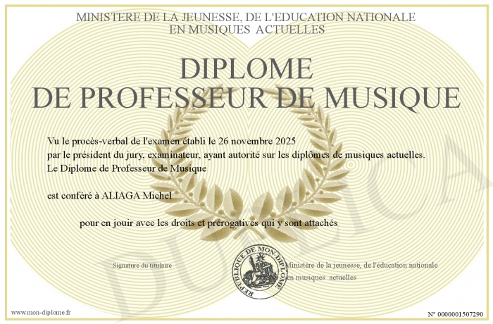 Envoyez par email votre Diplôme de Professeur de Musique personalisé