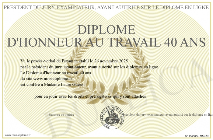 Envoyez par email votre Diplôme d'honneur au travail 40 ans personalisé