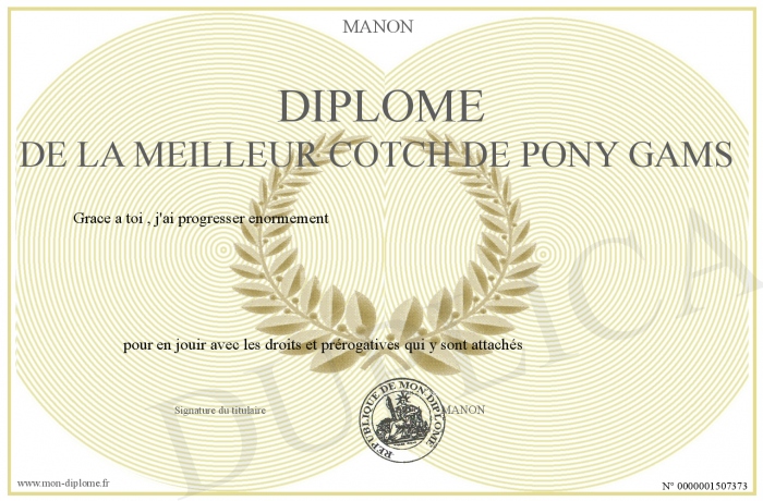 Envoyez par email votre DIPLOME DE LA MEILLEUR COTCH DE PONY GAMS personalisé