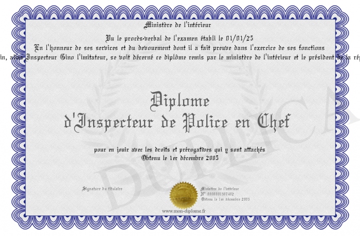 Envoyez par email votre Diplôme d'Inspecteur de Police en Chef personalisé